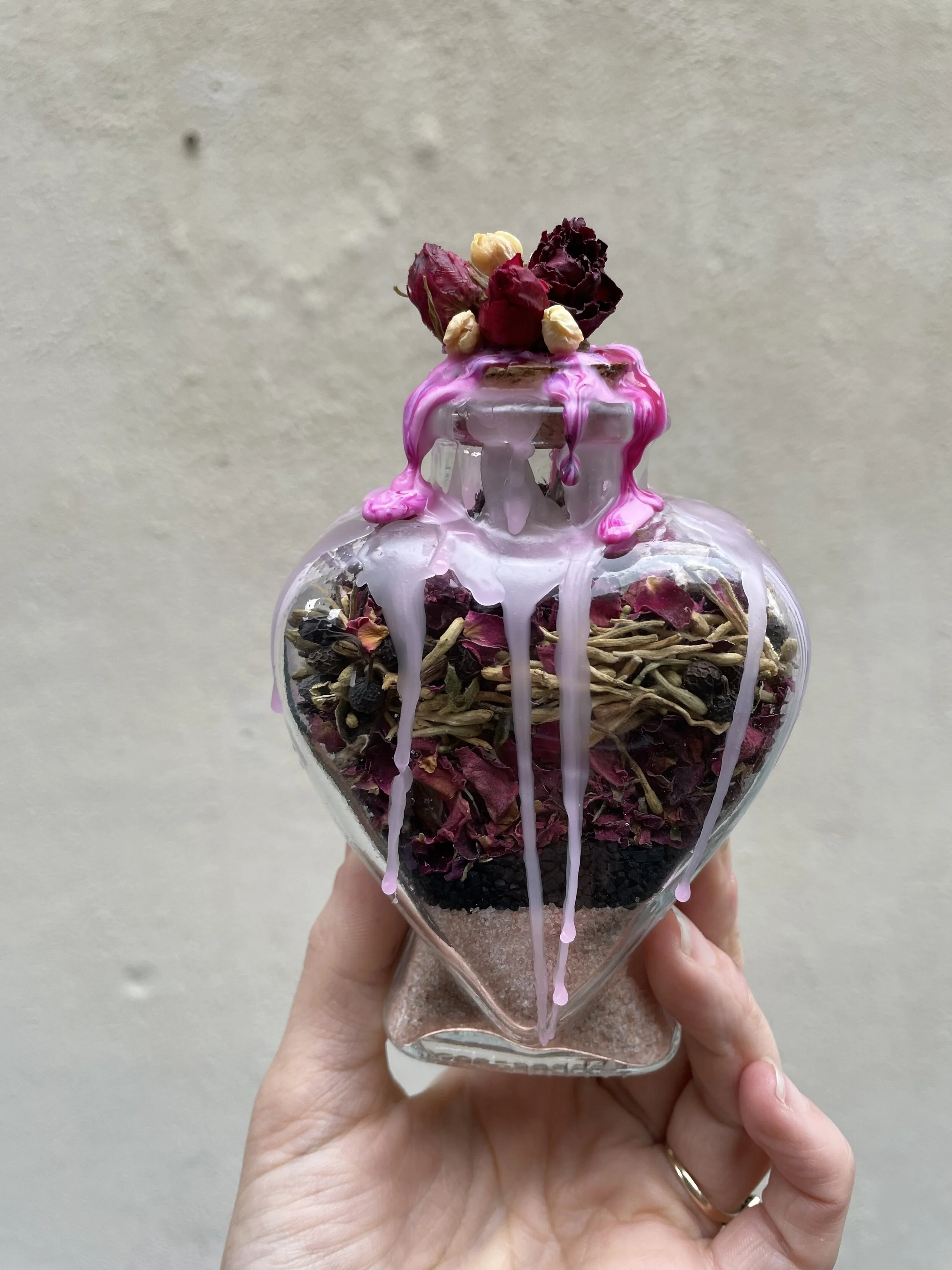 This heart-shaped glass jar is filled a careful mixture of herbs/minerals to enhance spell work concerning matters of love including:
